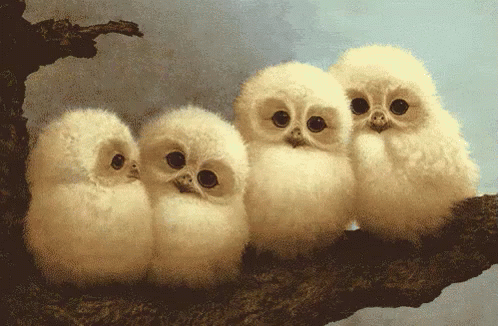 Four adorable baby owls perched together on a tree branch, looking curiously at the camera.