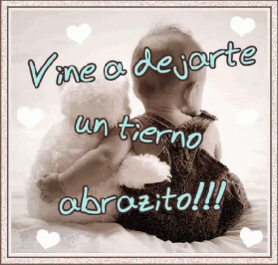 A sweet baby and teddy bear share a tender hug, with the message 'I came to leave you a tender hug!!!'
