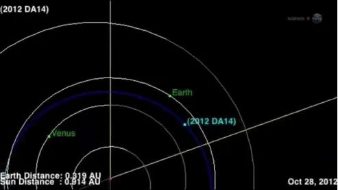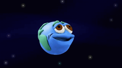Cartoon Earth character looking terrified as asteroids approach in space.