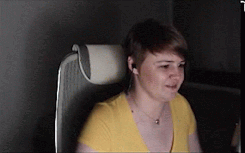 Tigra Mblpk, a woman in a yellow shirt, reacts with fear and ducks out of frame.