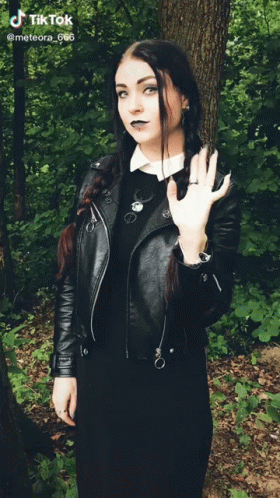 Meteora666, a goth girl in a black leather jacket, waves her hand in a forest setting.