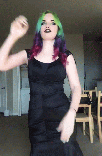 Oliveblack1 dancing in a black dress with vibrant colorful hair and black lips, showcasing her gothic style.