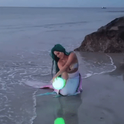 The Wandering Mermaid, with green hair, kneels on a beach at dusk, holding a glowing, color-changing orb.