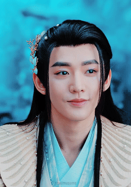 Xiao Lin from Till The End Of The Moon, in traditional attire, smiling gently against a blue backdrop.