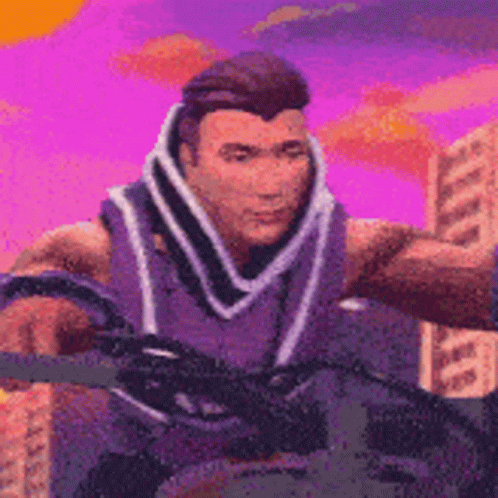Serega Pirat rides a motorcycle in a pixelated video game with a vibrant pink sky.