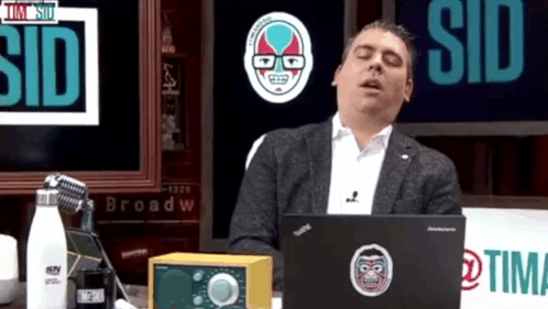Sid Seixeiro from Tim and Sid appears to be startled awake while sitting at his desk during a broadcast.