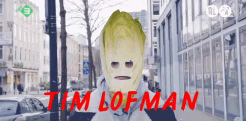 Tim Hofman, known as Tim Lofman, wearing a unique cabbage mask on a city street.