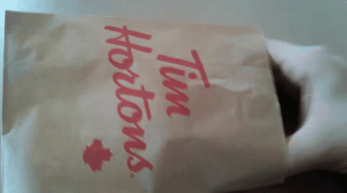 A delicious Tim Hortons Sour Cream Glazed Donut is taken out of its iconic paper bag, ready to be enjoyed.