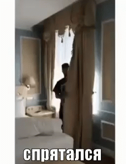 Timati hides behind curtains in a hotel room, seemingly embarrassed.