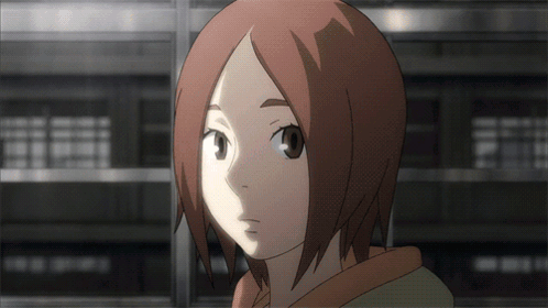 Akiko from Time of Eve, with short reddish-brown hair, stands thoughtfully in a futuristic cafe, wearing a green hoodie.