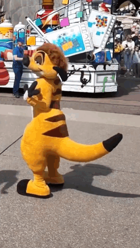 Timon mascot from The Lion King dancing energetically during a Disney parade with a colorful float.