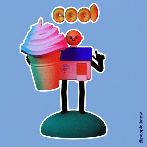 Timothy Winchester's 3D ice cream character with 'cool' text, pointing up.