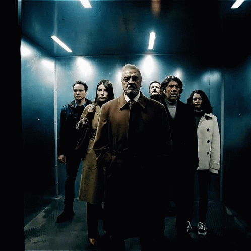 Deniz Baysal and Çağrı Ertuğrul with their team in a tense elevator scene from the Turkish series Teşkilat.