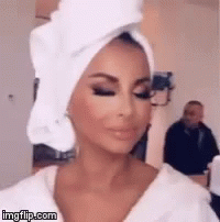 Tina Ivanovic showcases a glamorous makeup look with dramatic eyelashes and a white towel wrapped around her head.