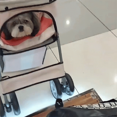 Doratzu, the adorable Shih Tzu mix, gives a cute puppy dog look from its pet stroller.