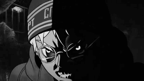 Anton, the Tinny Bunny character, with sharp fangs and glasses, in a dramatic black and white horror scene.