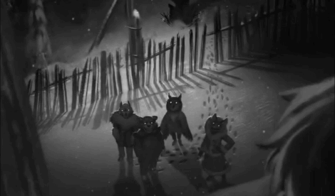 Four anthropomorphic animal characters from Tiny Bunny, including a wolf, rabbit, bear, and owl, in a snowy, fenced setting.