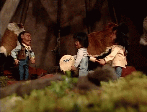 Tipi Tales puppets gather inside a teepee, with one puppet playing a drum while others watch and hold hands.