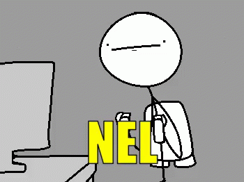 A stick figure reacts to something on a PC, then blasts off into space with 'NEL' text appearing.