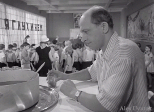 A man, possibly Alex Uyutov, looking utterly exhausted and overwhelmed, resting his head on his hand in a busy room.