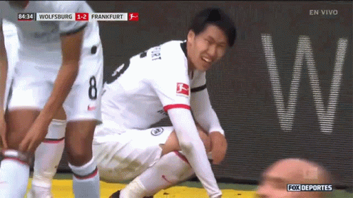 An Eintracht Frankfurt soccer player, wearing jersey number 8, crouches on the field, looking tired during a match.