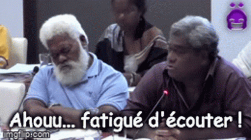 Kanak politician Jacques Lallier appears tired and asleep during a meeting, with the caption 'Oh... tired of listening!'