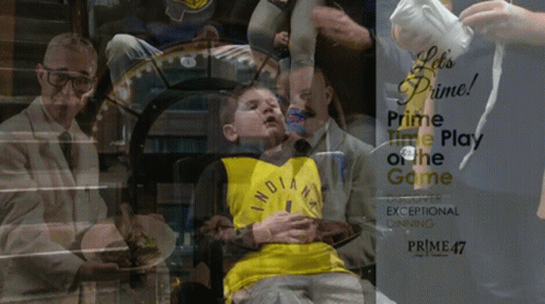 A young boy in an Indiana Pacers jersey looks tired, then wakes up and smiles at the game.