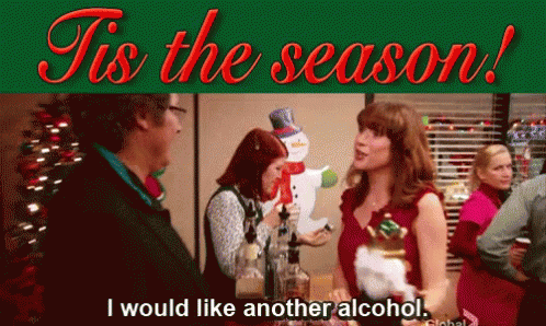 Erin Hannon from The Office at a Christmas party, humorously requesting 'another alcohol' while 'Tis the season!' is displayed.