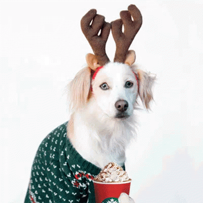 A dog in a Christmas sweater and reindeer antlers holds a Starbucks cup, celebrating the season for animals dressed as other animals.
