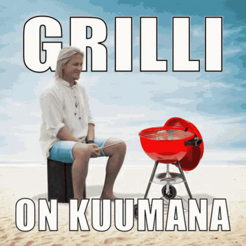 Sami Kuronen, the Tisuomi Grillimestari, attempts to grill a sausage on a hot grill on the beach.