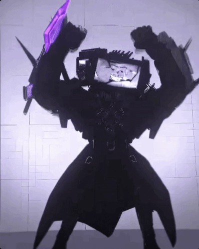 The shadowy Titan TV Man from Skibidi Toilet, with a distressed face on his screen, raising his arms.