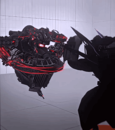 Titan TV Man, a robot with red lights, is attacked by a shadowy figure with a sword in a meme.