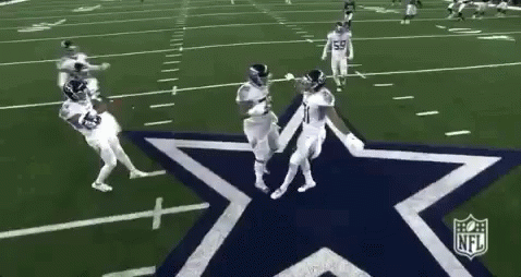 Tennessee Titans players celebrate on the Dallas Cowboys star logo after a play, including Byard.
