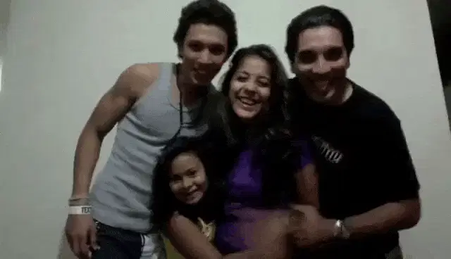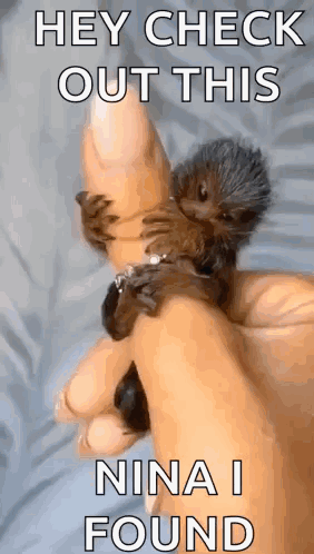 A tiny titi monkey, also known as a pygmy marmoset, held in a hand with the caption 'HEY CHECK OUT THIS NINA I FOUND'.