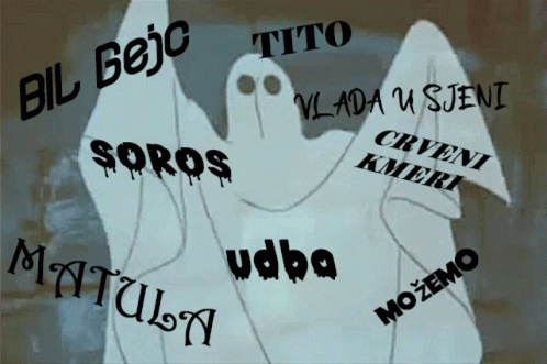 A ghost figure surrounded by names like Tito, Soros, Bill Gejc, Crveni Kmeri, Udba, Vlada U Sjeni, Možemo, and Matula.