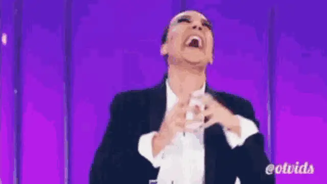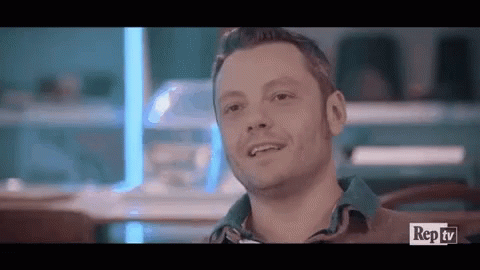 Tiziano Ferro laughing joyfully, featured in a Rep TV segment with a wide smile.