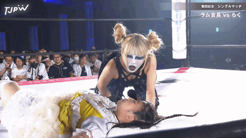 two women in a wrestling ring with tjpw written on the bottom right