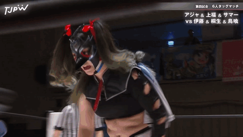 a woman in a wrestling ring with the tjpw logo on the bottom