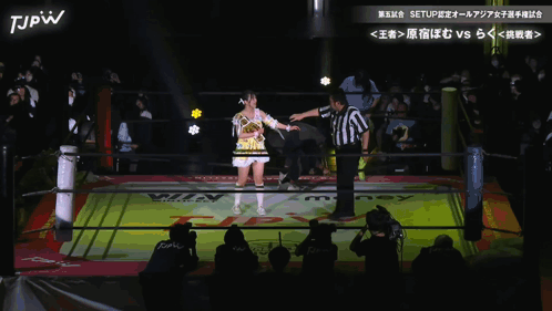 a woman stands in a wrestling ring holding a referee 's hand with tjpw written on the bottom right