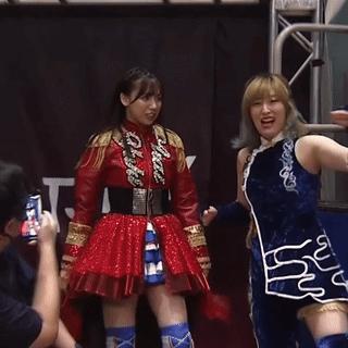 two women standing next to each other with one wearing a red dress