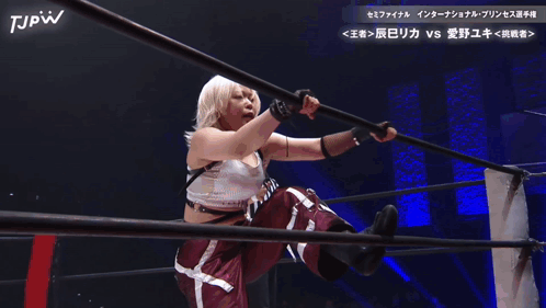 a woman laying on the ground in a wrestling ring with a referee standing behind her and the word tjpw on the bottom