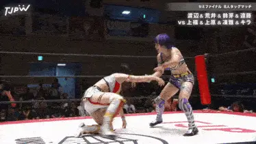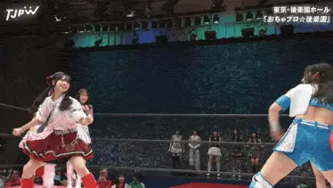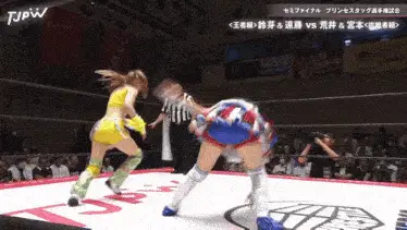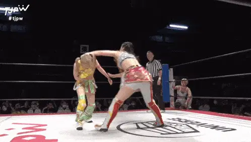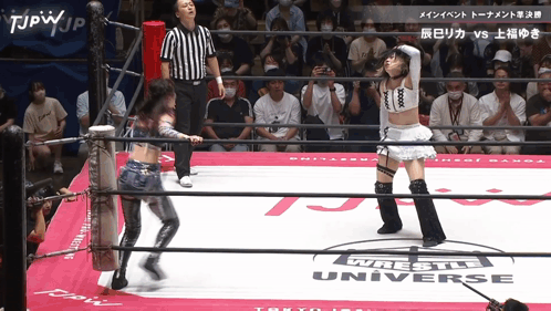 two women in a wrestling ring that says wrestle universe on it
