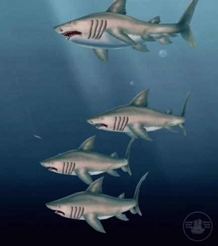 A group of animated sharks swim menacingly in the ocean, a scene reminiscent of The Legend Of Pirates Online (Tlopo).