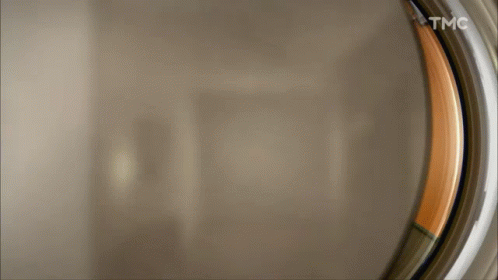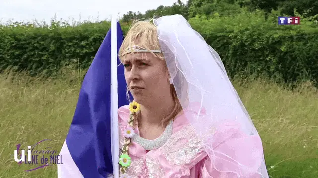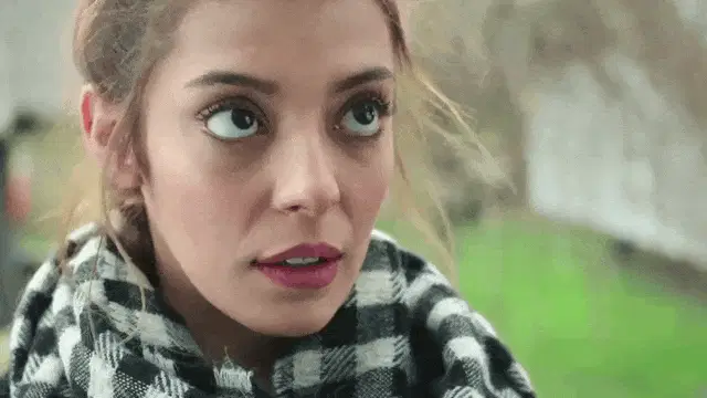 Joy Esther as Chloé walks down a hallway with a fisheye lens effect, from the show Nos Chers Voisins.