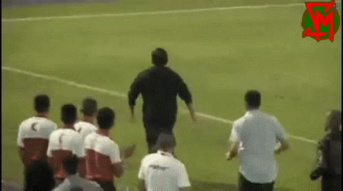 A person runs onto a football pitch and dramatically kicks the corner flag, causing it to fall.