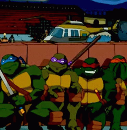 Leonardo, Donatello, Michelangelo, and Raphael from TMNT 2003 share a laugh, with Raphael covering his mouth.