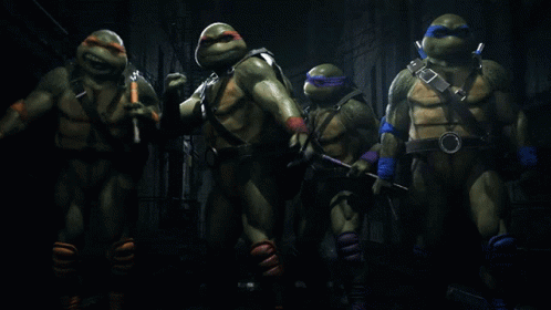Donatello, Leonardo, Michelangelo, and Raphael, the Teenage Mutant Ninja Turtles, are seen jumping in action.