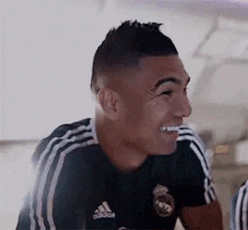 Football stars Casemiro and Marcelo share a joyful moment, laughing together while wearing their black Adidas jerseys.