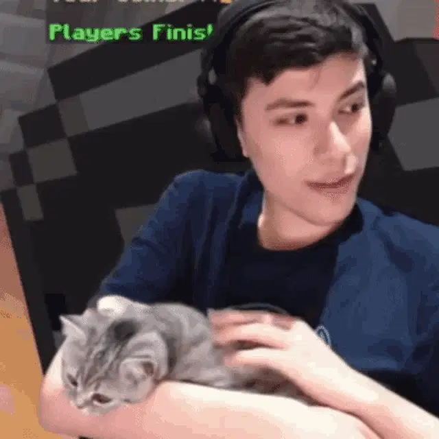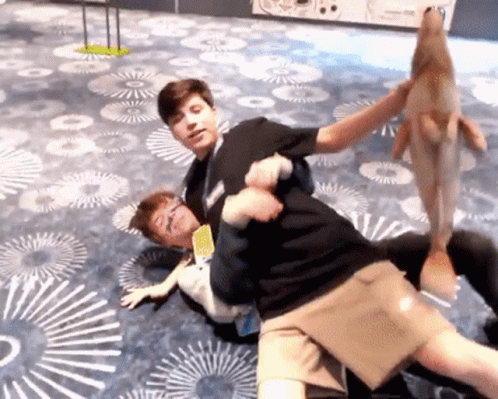 Karl Jacobs and Gnf playfully rolling on the floor at an event, with Gnf holding a plush toy.