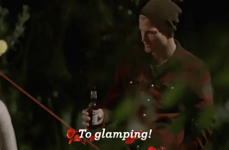 Man in beanie and plaid shirt making a toast with a bottle, celebrating glamping.